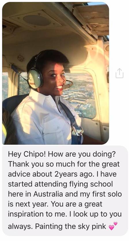 Orgulhosa do feito e das pessoas que inspira, Chipo compartilhou uma mensagem que recebeu da pilota Valerie Jeche, da Austrália, a quem já havia dado dicas sobre a profissão anos antes. “Oi, Chipo. Como está? Muito obrigado pelo conselho que me deu cerca de dois anos atrás. Comecei a estudar e a treinar em uma escola de aviação, aqui na Austrália. Meu primeiro voo solo é no ano que vem. Você é uma grande inspiração para mim. Vamos pintar o céu de rosa!”, escreveu Valerie.