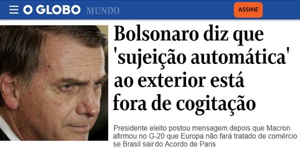 Foi só o presidente francês, Emanoel Macron, dizer que a França não queria acordos comerciais com países que saíssem do Acordo do Clima firmado em Paris, em 2015, que o presidente eleito Jair Bolsonaro teve um surto de “nacionalismo”. ||| “Sujeitar automaticamente nosso território, leis e soberania a colocações de outras nações está fora de cogitação”, afirmou o presidente eleito na sua conta do Twitter. Horas depois de ter batido continência para o assessor de Segurança Nacional de Donald Trump, a declaração ganha ares de piada. ||| É evidente que o Brasil deve participar de qualquer negociação 'bi' ou 'multilateral' de olho dos seus próprios interesses. Mas como explicar que façamos isso declarando, por mero capricho ideológico, que vamos transferir nossa embaixada em Israel para Jerusalém, deixando irritados os árabe que nos importam produtos em grande quantidade? ||| Para que provocar o Irã, que está salvando nossas exportações de milho, ameaçada pela queda de preço e por uma supersafra no “Corn Belt” do Nordeste dos EUA. ||| Porque esnobar o Mercosul, nosso mais próximo e fácil mercado? A resposta é simples: ser sabujo de um é ser valente com outro, ainda mais sabendo que Trump não cruza os bigodes com o presidente francês.