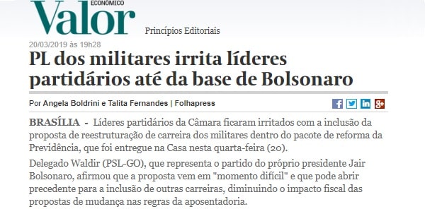 "Como era de esperar, a proposta previdenciária para os militares traz mais danos à tramitação da reforma da Previdência que benefícios para as contas públicas. É que aquilo que será exigido a mais em tempo de serviço e em contribuição para a aposentadoria é totalmente coberto pelo aumento das gratificações pagas aos integrantes das Forças Armadas, em especial aos oficiais graduados, que receberam parcelas muito mais generosas que a tropa em matéria de representação (...) Mas nada será comparável à irritação dos policiais e bombeiros militares dos Estados, que “ganham” as novas exigências para se aposentarem mas não recebem um tostão das vantagens concedidas às Forças Armadas." ||| Leia FERNANDO BRITO no TIJOLAÇO...