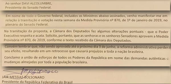 "O governo Bolsonaro produziu o mais difícil: criou uma situação de atrito na casa parlamentar que lhe é mais – disparadamente, aliás – favorável: o Senado Federal. (...) E aceitou a situação humilhante de mandar (veja na imagem acima) uma carta ao Senado – em que se lembrou, com propriedade, da última vez em que um presidente fez isso foi Jânio, em sua renúncia(1961) – admitindo não ter como orientar sua própria bancada pela conversa, sendo forçado a assumir, com assinatura e tudo, uma 'nota promissória' inaudita." ||| Leia a íntegra de FERNANDO BRITO, no TIJOLAÇO.