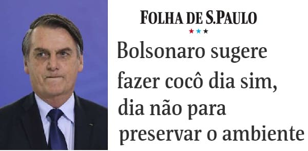 Você pensava que Jair Bolsonario ia parar no primeiro degrau da escatologia com a história do “golden shower”? Não, ele passou, como dizia a minha avô aos netinhos pequenos, do “Número 1” para o “Número 2”, sugerindo(AQUI) ao repórter que o entrevistava que “fazer cocô dia sim, dia não” é uma forma de preservar o meio-ambiente. ➤ — É só você deixar de comer menos um pouquinho. Você fala para mim em poluição ambiental. É só você fazer cocô dia sim, dia não, que melhora bastante a nossa vida também. Além de um idiota, um porco. Como não dá para falar sério de um sujeito assim, eu peço licença a Reinaldo Azevedo para roubar o bordão “Momento Cultural” de seu programa de rádio. ➤ É que 'escatologia' tem dois sentidos, o mais conhecido deles o de estudo sobre as fezes, as quais, segundo Bolsonaro, devem ser racionadas para a salvação da Terra, que vem do grego skór, pelo genitivo skatós. Mas também é escatologia, com outra origem grega (éskhatos, éskhaton, extremo, final) a especulação , em geral mística-teológica, do que se passaria ao chegar-se ao “fim do mundo”, à extinção da vida. ➤ E não é o fim do mundo um presidente da República dedicar-se à asneiras desse tipo? Até desperta dúvidas se os competentes médicos que o atenderam religaram corretamente os intestinos. Pode ser que em algo ele tenha razão: se o presidente falasse apenas dia sim, dia não, melhoraria “bastante a nossa vida também”.