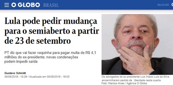 "Reportagem de O Globo hoje dá números concretos ao que se disse aqui sobre o absurdo de fazer a transferência prisional do ex-presidente Luís Inácio Lula da Silva, não apenas com um habeas corpus pendente no STF como a um mês e meio de sua progressão de regime penal: A partir de 23 de setembro o ex-presidente poderá pedir para deixar o regime fechado. Com isso, o preso deixa a cadeia durante o dia para trabalhar e retorna à noite para dormir. Por se tratar de um ex-presidente, a defesa pode pedir que Lula fique em prisão domiciliar. Ou que o petista saia de casa para trabalhar durante o dia e se recolha à noite e durante os finais de semana e feriados. ➤ Dentro de 45 dias, portanto." ➤ Leia mais FERNANDO BRITO, no TIJOLAÇO.