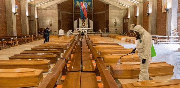 A imagem aí acima, da Igreja de São José, na cidadezinha (menos de 30 mil habitantes) de Seriati, na Lombardia italiana, deveria ser o bastante para afastar um homem que diz que a “gripezinha” não mata e estes corpos são “apenas” frutos malditos da idade e do frio. Pois é isso, é escandalosamente isso o que virá. >>> Virá enquanto o Ministro da Saúde, para vergar a espinha ao Psicopata, relativiza a importância de todos nos submetermos ao isolamento, exceto aqueles essenciais para garantir a vida, o alimento e o respeito às normas da quarentena social. >>> Virá enquanto o Ministro da Economia, em lugar de providenciar rápido os recursos para socorrer quem precisa ficar em casa para defender a si e sua família, nem sequer sabe como fazer chegar a eles o pouco que lhes dará e sugere mandar 40 milhões às agências da Caixa Econômica, numa estupidez sem par. Gasta duas horas de seu tempo, precioso, em videoconferência com “investidores da XP”, aquela da qual Luciano Huck era garoto-propaganda. >>> Virá enquanto os muares do capitão desfilam pela rua em seus carros fechados, buzinando para espantar pessoas aos matadouros. Virá enquanto os generais de pijama que estão aderidos a uma imobilidade e a uma falta de comando criminosas de seu comandante em chefe, o Presidente da República. >>> Virá, porque até o vice-presidente, ainda que se escafedendo do dever de advertir que é inaceitável o comportamento de Bolsonaro, reconheça que “está havendo uma falta de coordenação das ações”. >>> Virá, porque estamos vendo isso ocorrer em toda a parte: 900 mortos por dia na Itália e na Espanha, 500 nos EUA, 300 na França e no Reino Unido, todos com estruturas de saúde mais amplas e equipadas que as nossas. >>> Nada mais importa discutir enquanto não se fizer o essencial: reduzir esta fila de caixões. Passou muito da hora de agir e repito o que disse ontem: é preciso desobedecer todas as ordens irresponsáveis de Jair Bolsonaro e não ir à rua o máximo que pudermos e isso significa suspender as demissões, organizar a distribuição de gêneros essenciais, proteger nossas equipes médicas com equipamento e sistemas de desinfecção especiais, operados pelas Forças Armadas. >>> E preciso, sem eufemismos, dizer com clareza o que virá e fazer tudo o que pudermos para que não venha com a força macabra da imagem acima, que abre este texto.