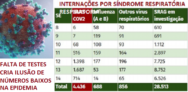 Quando, nos próximos dias, explodir o número de pessoas infectadas no Brasil pelo novo coronavírus, não se iluda. Não é que a doença, que se expande velozmente, tenha dado um salto no ritmo já acelerado de contágios. É que vão começar os testes, com a prometida chegada, até amanhã, de 450 mil reagentes moleculares, infelizmente o precaríssimo critério adotado pelo Ministério da Saúde para dimensionar a incidência de casos de infecção pelo vírus. >>> Até agora, sem eles, está se formando um imenso estoque de casos suspeitos que, amanhÃ, vão ser despejados nas estatísticas de “casos confirmados”. Considerando apenas os casos de Síndrome Respiratória Aguda Grave que resultaram em internações hospitalares (veja tabela acima, do boletim epidemiológico oficial(AQUI) do MS) há praticamente sete vezes mais eventos suspeitos que os confirmados. >>> 28 mil internações hospitalares é mais que o dobro dos registros atuais da pandemia e isso não inclui os casos leves, diagnosticados clinicamente que são mandados se isolar em casa. >>> É evidente que, como as demais hipóteses infecciosas são pouco significantes diante do total – estão abaixo de 3% das internações totais – a imensa maioria destas internações em investigação são de problemas causados pelo vírus Sars-COV2. >>> O fato de Luiz Henrique Mandetta estar sendo uma barreira a que Jair Bolsonaro coloque um “terraplanista” na Saúde não o exime do dever de alertar a população para uma escala epidêmica que vai muito e muito além dos números ora anunciados, numa subestimação inexplicável. >>> A manchete de O Globo, nesta terça(14), dizendo que Cientistas estimam que número de infectados no Brasil(AQUI) é 15 vezes maior que o oficial pode até ter algum exagero, aceitável em estimativas, mas não está mais distante da realidade dos números oficiais. >>> Pode ser até que alguns jornais e jornalistas achem que isso é politicamente ruim, pois enfraquece Mandetta. Não é verdade, ele é quem se enfraquece ao não comunicar à população o tamanho do desafio que temos a enfrentar. E isso é mais uma razão para não se deixar Bolsonaro colocar um “terraplanista” na Saúde.