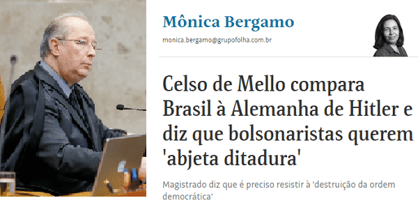 Nada foi mais importante, nos últimos tempos, que a mensagem de Celso de Mello aos demais ministros do Supremo Tribunal Federal, que mencionei no post(AQUI) anterior, marca a ruptura total entre o STF e o governo Bolsonaro. >>> Ao acusar Jair Bolsonaro de executar um plano de tomada de poder semelhante ao de Adolf Hitler, o decano da Suprema Corte traçou uma linha de demarcação não só entre seus colegas como, também, em relação ao Parlamento. >>> Ao contrário do 'mimimi' de Rodrigo Maia e Davi Alcolumbre, o velho juiz agiu com altivez e, a meses de deixar a cátedra do Tribunal deu um sinal inequívoco de que a omissão será igual à cumplicidade com o avanço fascista. Não lançou uma luva, deu uma bofetada, como a ocasião exige. >>> Celso de Mello porta-se como Churchill em lugar de Neville Chamberlain: ambos conservadores, mas um deixa claro que não há tergiversação ou pacto possível com o nazismo. >>> Pode, é certo, haver intuitos provocadores em alguns dos participantes dos atos antibolsonaro acontecidos hoje, mas eles correspondem ao sentimento das ruas e vão crescer. >>> A oposição de esquerda – e agora já existe uma oposição de direita definida – precisa assumir seu papel neles, com ou sem pandemia. Porque eles vão crescer, seja pela rejeição à direita aos propósitos golpistas de Bolsonaro, seja pelo estresse em que está uma sociedade insegura e amedrontada, mas é preciso não deixar que descambem para uma violência juvenil, que levem água ao moinho da repressão. >>> Neste sentido, a mensagem de Celso de Mello, direta e inequívoca, mostra que há espaço para o caminho da legalidade e que ela não protege o golpismo nazista, mas o condena, inapelavelmente.